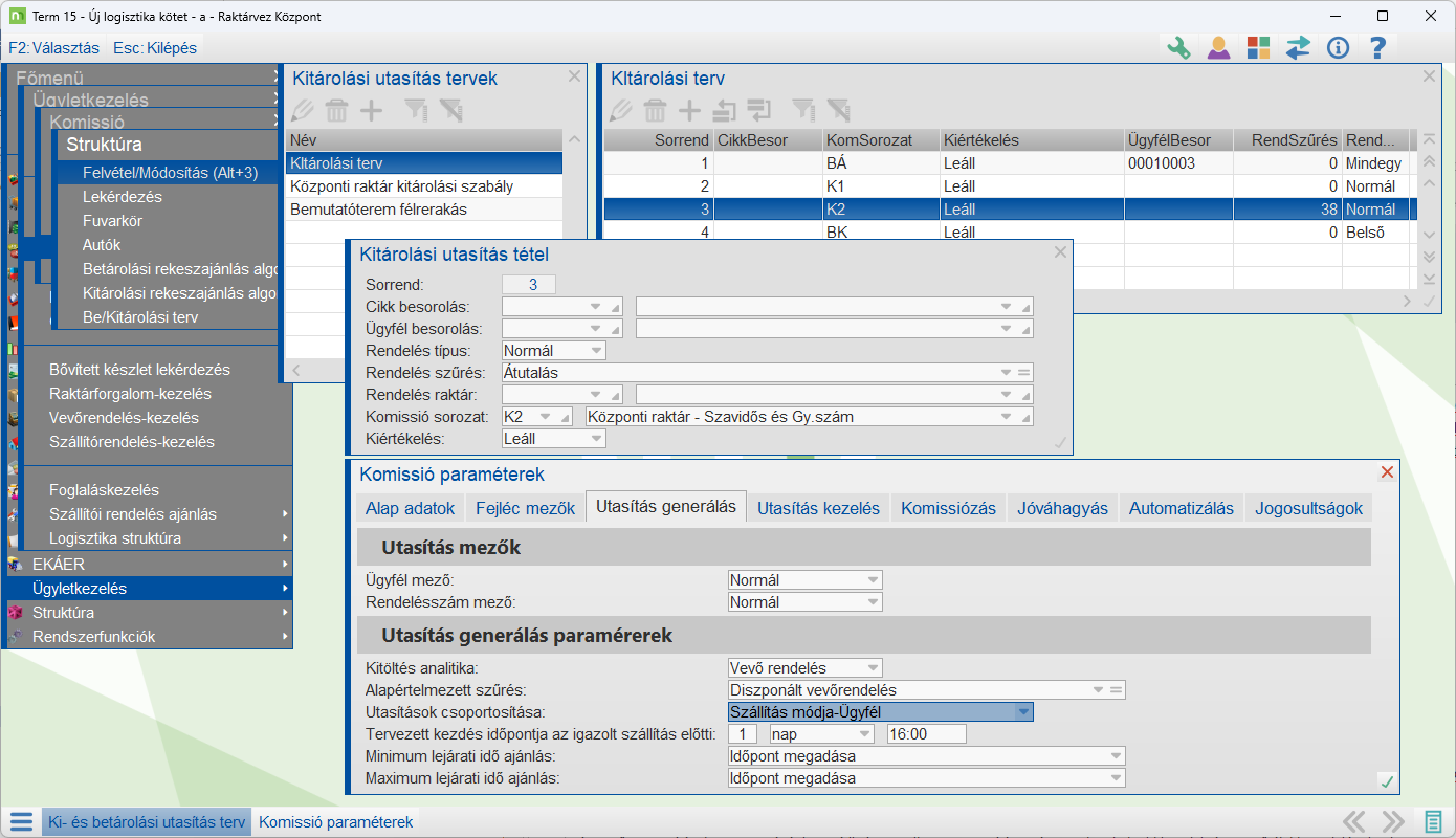 A ki-be tárolandó termékek tulajdonsága vagy a vevőrendelés bizonyos jellemzői alapján (Pl.: Fizetési mód stb...) alapján, különböző komissió sorozatra tud utasítás generálni a program.