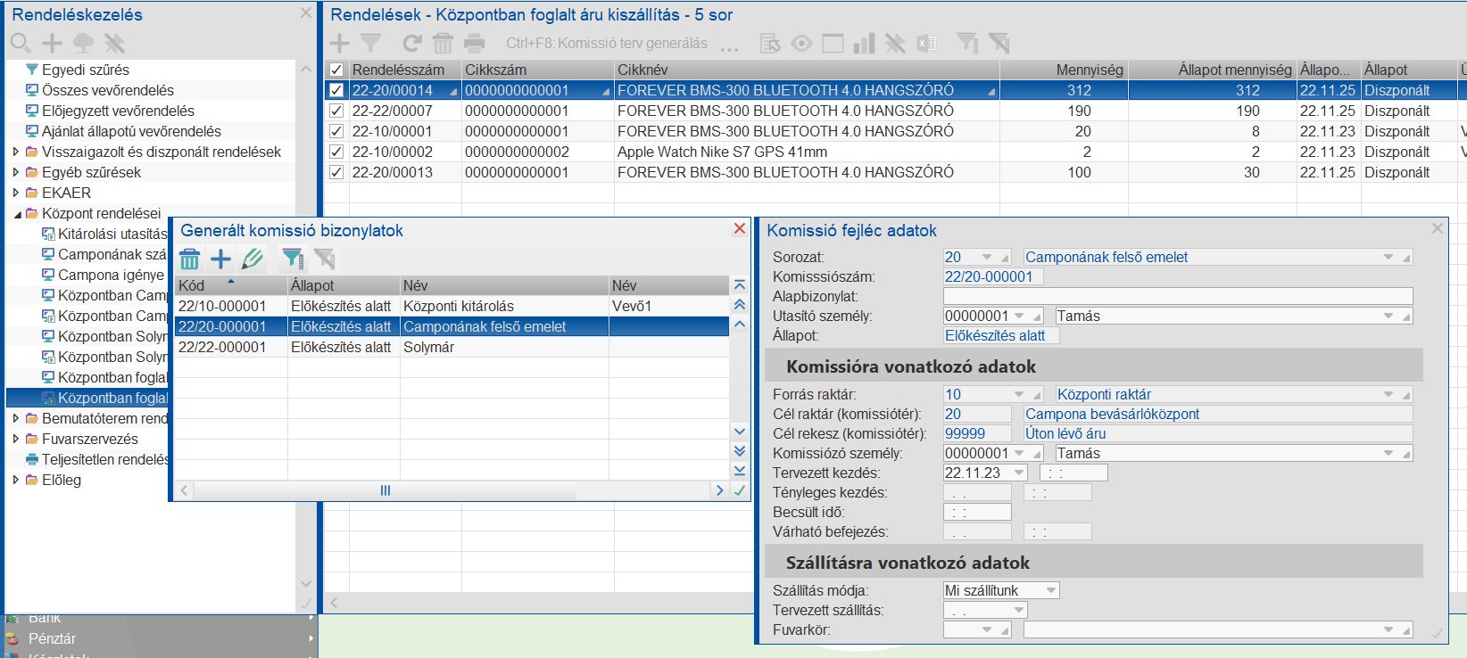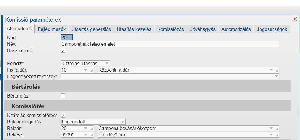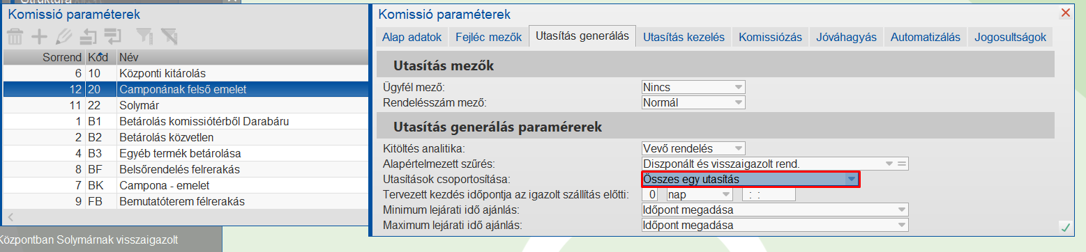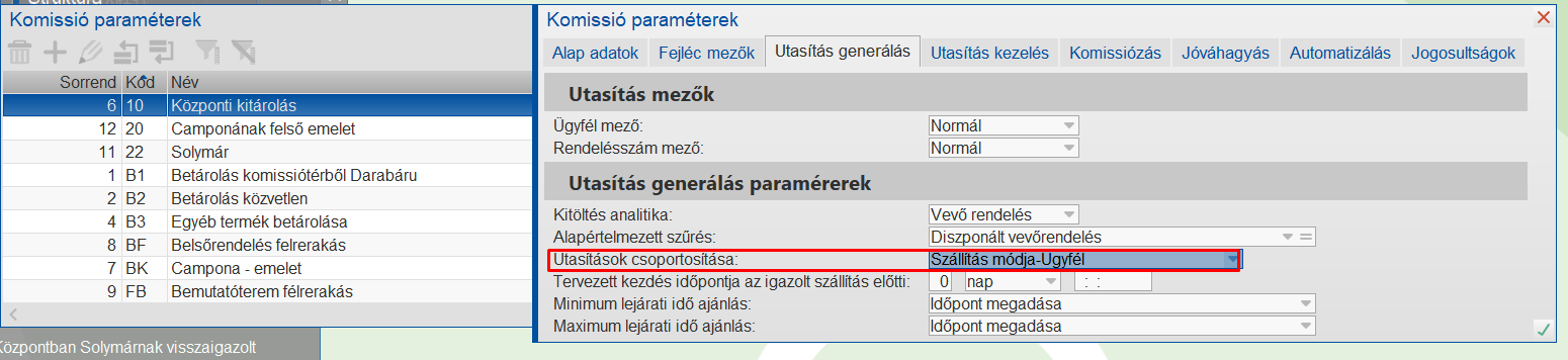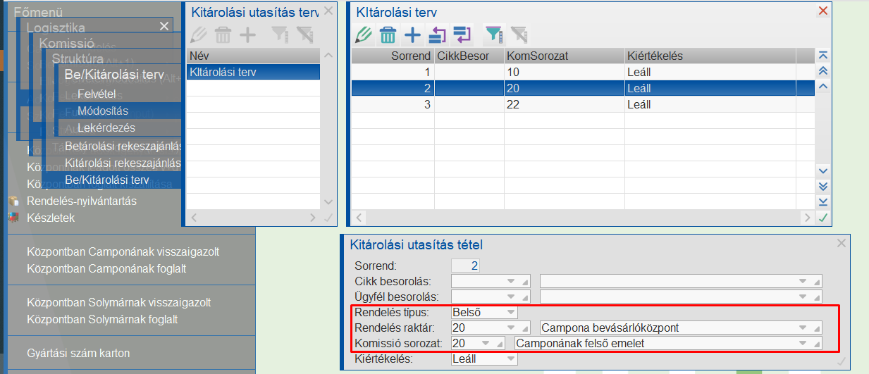 Belső rendelés esetén a kitárolandó rendelésből a célraktárt fogja figyelni a program és azt egyezteti a paraméterben megadott Rendelés raktár értékével, és ennek megfelelően választja ki a rendeléshez a komissiósorozatot.