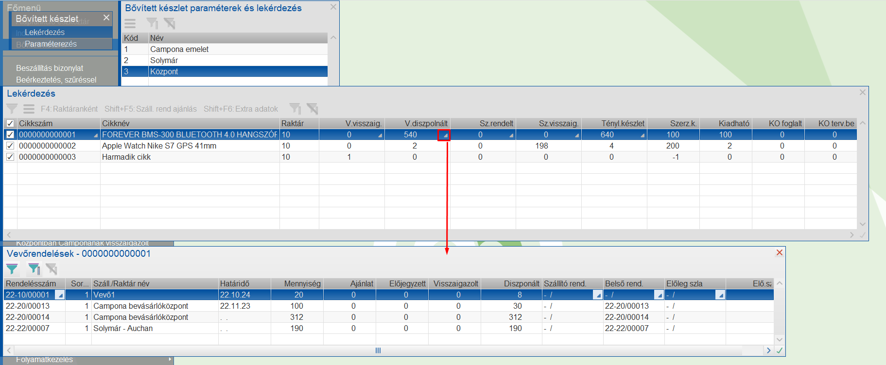 Ebben a funkcióban a Vevő diszponált mezőre "lefúrva" láthatjuk az adott cikkre vonatkozó foglalásokat.