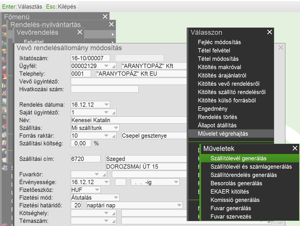 Van értékkel lehetőségünk lesz a sorozattal készült rendelésből fuvar bizonylatot generálni. Ha van művelet, megadhatjuk azt a szűrést, amelynek megfelelő tételek fognak csak a műveletben részt venni a rendelés összes tétele közül. |