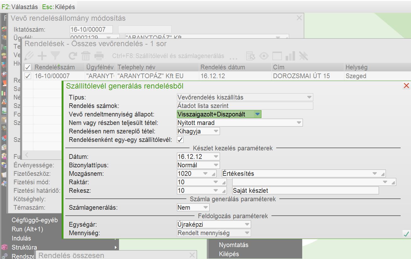 Van értékkel lehetőségünk lesz a sorozattal készült rendelésből szállítólevelet generálni. Ha van művelet, megadhatjuk azt a szűrést, amelynek megfelelő tételek fognak csak a műveletben részt venni a rendelés összes tétele közül. A Szállítólevél generálás funkció indul el a művelet elindítása után. |