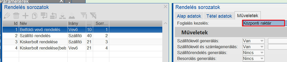 A rendelésorozatok funkcióban a Műveletek fülön lehet kiválasztani a Szállítható rendelések funkcióban definiált foglalási szabályt.