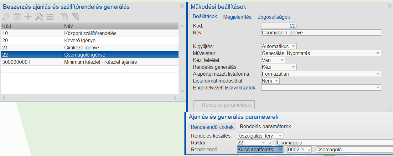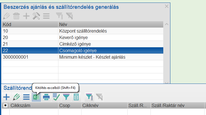 Arra az esetre, ha a beszerző az előbb említett szempontok miatt a rendelendő mennyiséget egy Excel táblában határozza meg, fejlesztettük ki, hogy a külső adatforrás alapján is fel lehet tölteni a szállítórendelés ajánlás funkciót.