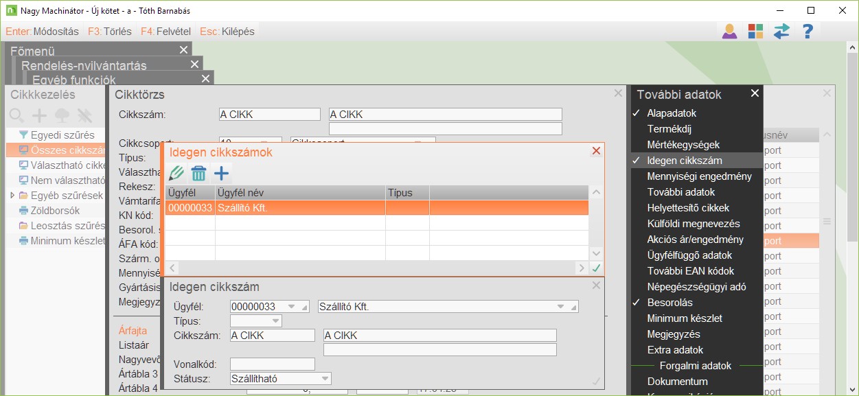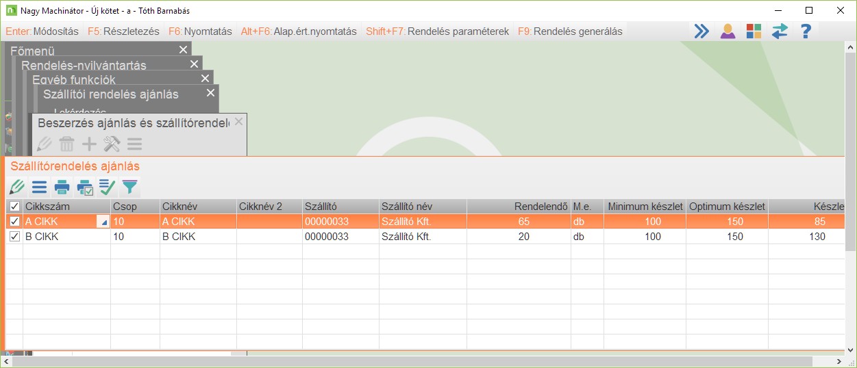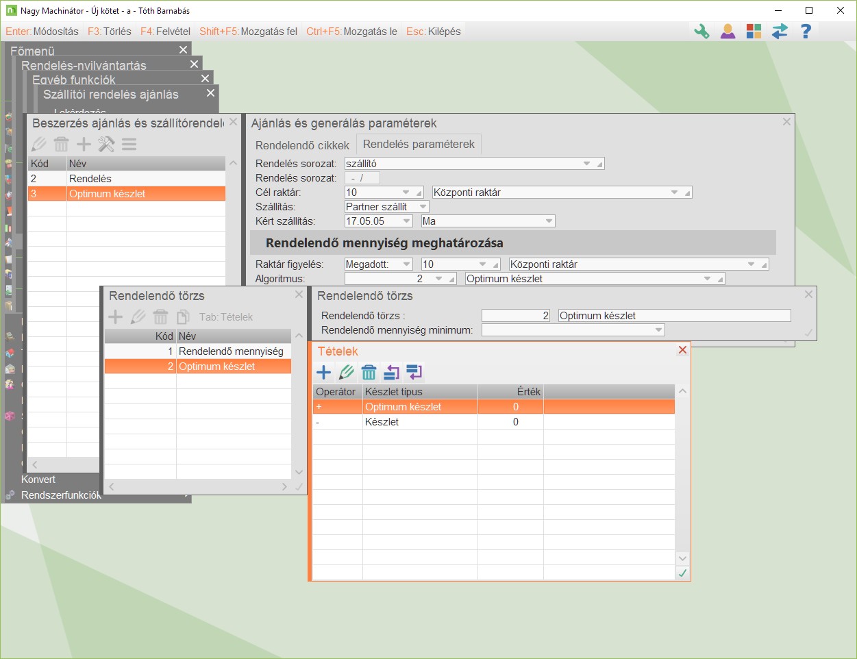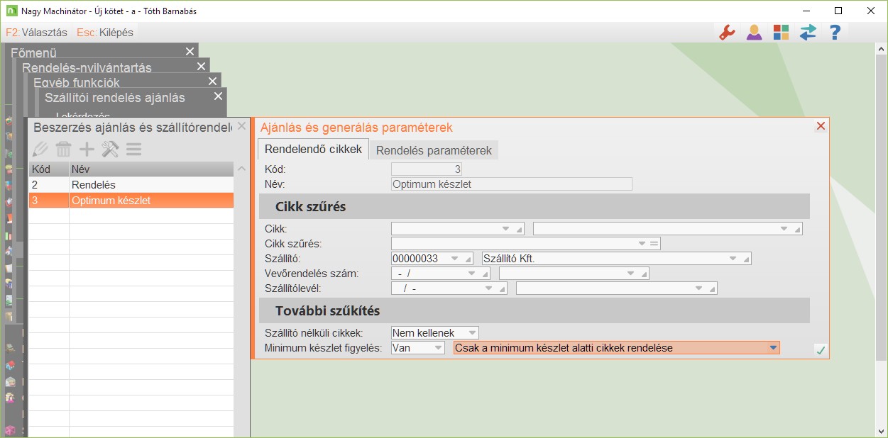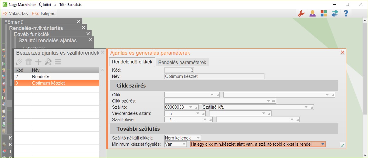 A Szállító rendelés ajánlás paraméterek beviteli ablakában (a Módosítás menüpontban érhető el) F4-gyel vehetünk fel új paramétert, szóközzel (Space) módosíthatjuk a paraméterek működési beállításait, F7-tel pedig a rendelési beállításokat.