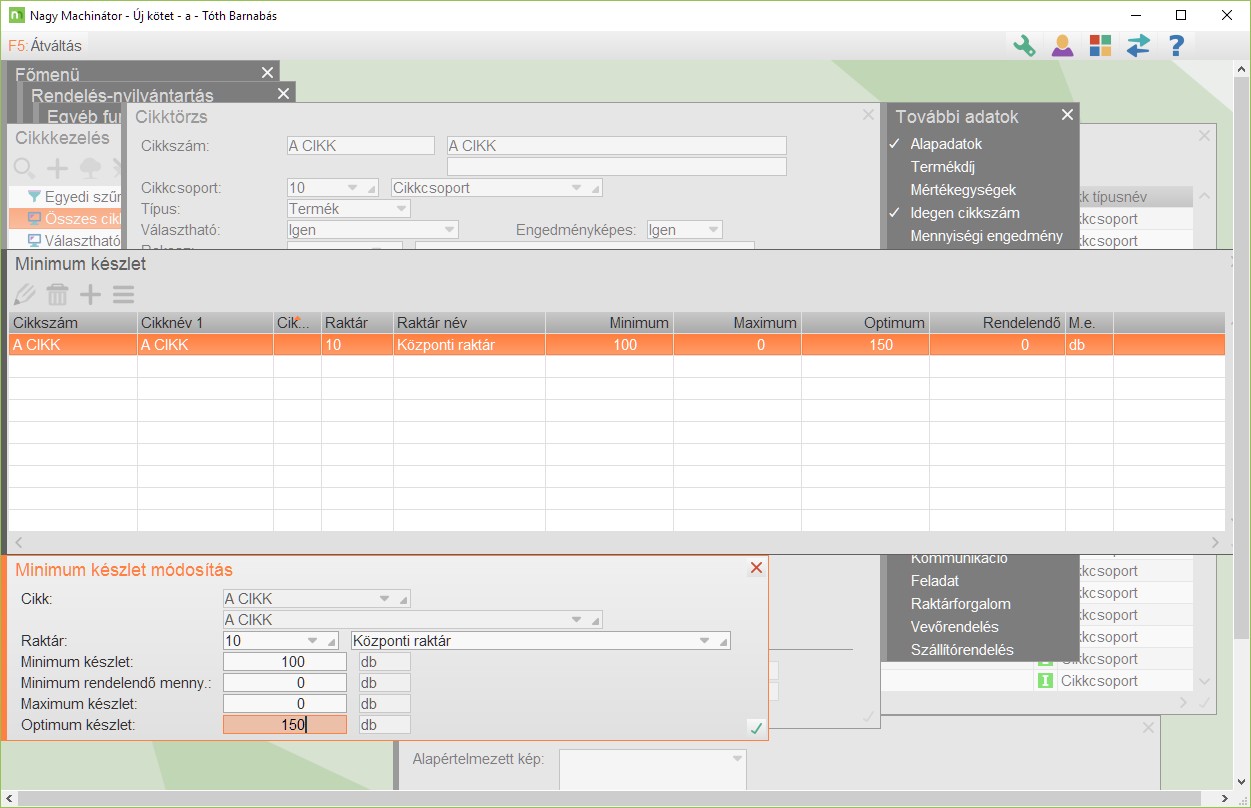 Az ajánlás kiértékelésébe bevonhatjuk a minimum készlet figyelést is, melyben (akár raktáranként, akár globálisan) rögzíthetjük egy cikk minimum készletét, minimum rendelendő mennyiségét és optimum készletét is.