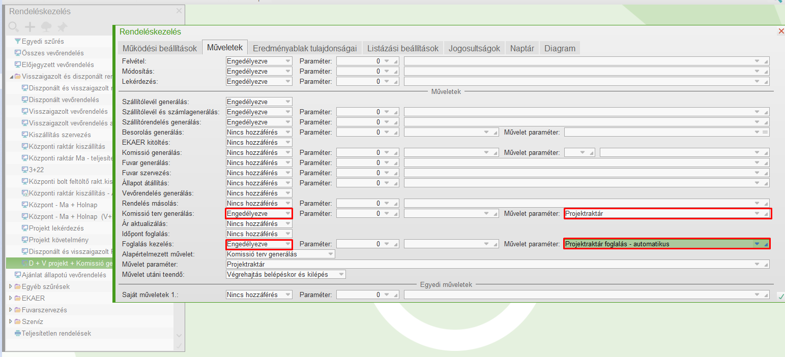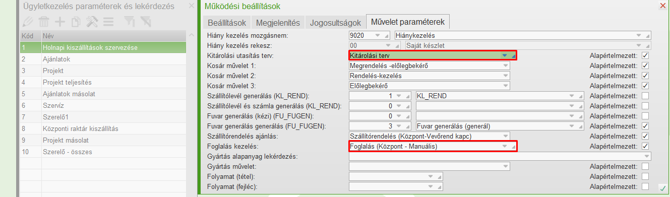 Foglalás-kezelés műveletet meg lehet adni a vevőrendelés sorozat funkcióban és az vevőrendelés-kezelés műveletei között is. (lásd alábbi kép)