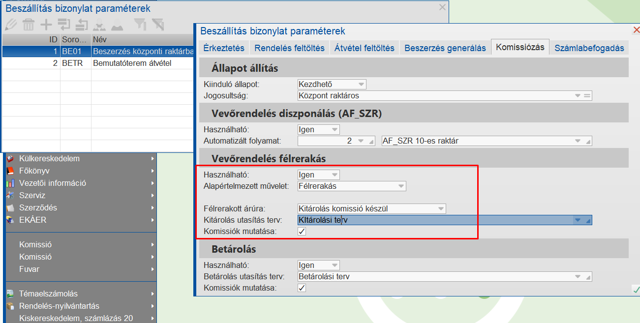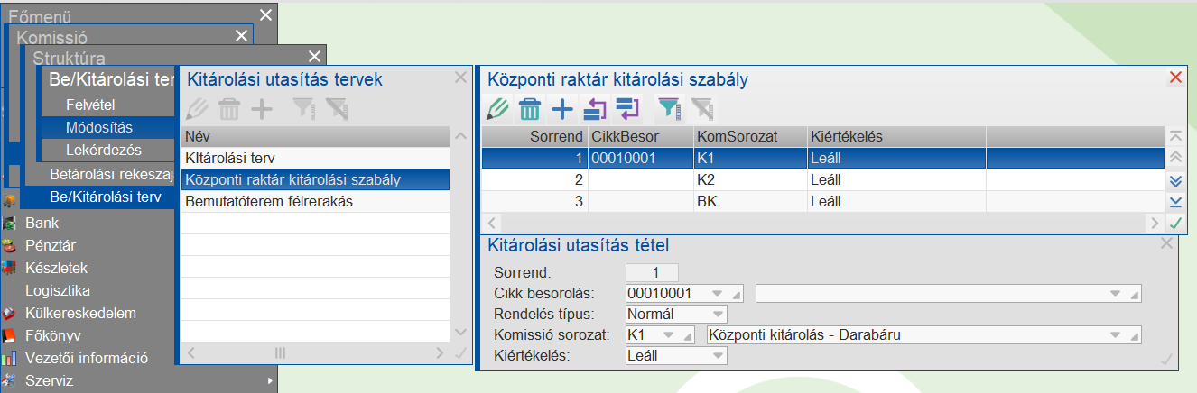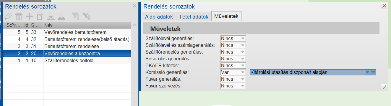 - Betárolási utasítás művelet esetén egy komissióutasítás sorozatot lehet megadni.