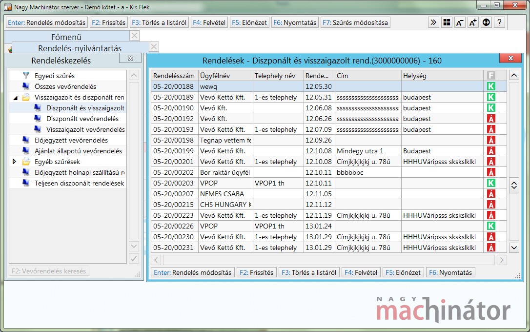 A funkcióban a Rendelés-nyilvántartás modulban felvett vevő és szállítórendelésekre vonatkozó szűrési feltételeket lehet előre definiálni.