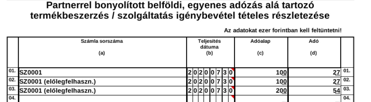 Ebben az esetben egy előleggel csökkentett végszámla átadása az M-es nyomtatványba (feltételezve, hogy az előleg is azonos áfa időszakon belül realizálódott) a következőképpen néz ki:
