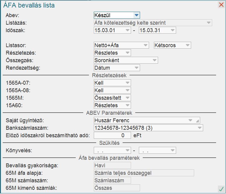 Az első áfabevallás elkészítése előtt érdemes egyszer elindítani a funkcióba épített újrakalkulálást. Lásd fenti képen: F5: Pénzforgalmi és 65M újraszámolás.