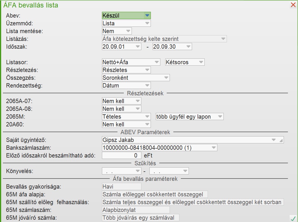 Az első áfabevallás elkészítése előtt érdemes egyszer elindítani a funkcióba épített újrakalkulálást. Lásd fenti képen: F5: Pénzforgalmi és 65M újraszámolás.