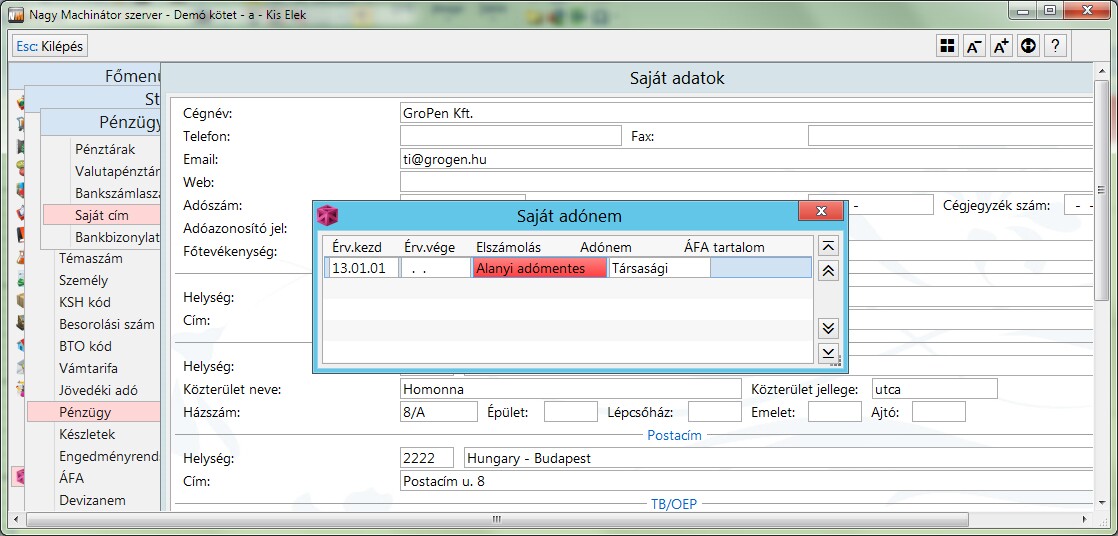 A Saját adat funkcióban, a F7:Saját adónem funkció gomb megnyomása után lehet megadni az alanyi adómentesség kezdő dátumát.