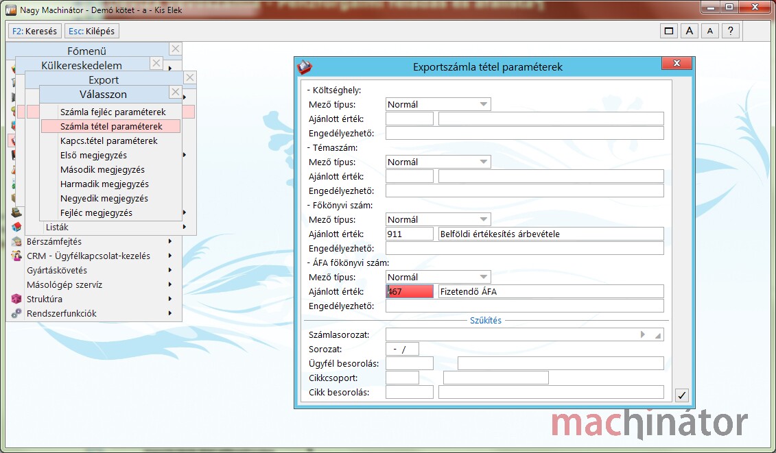 Az első számla felvétele előtt az Exportszámla paraméterek funkcióban érdemes előre megadni a kontírozás szabályait.