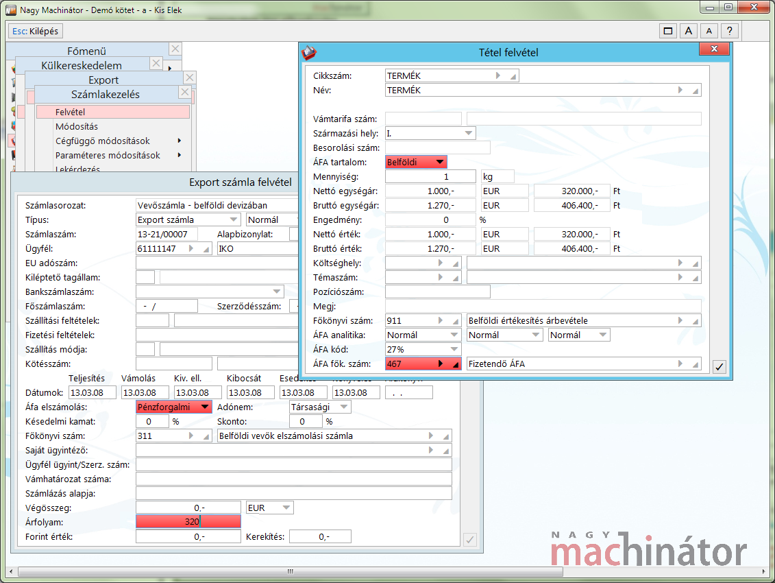 Az Áfa elszámolási főkönyvi számra a számla VPI árfolyamán került kiszámolásra az áfa összege (320 Ft/EUR x 270 EUR = 86400 Ft )