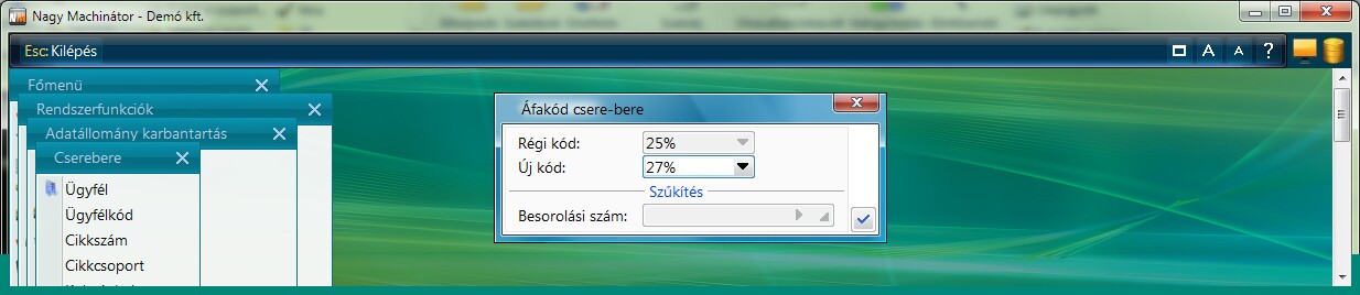 Az Áfa kód csere-bere akció a BIGMAC menüben a Rendszerfunkciók / Adatállomány karbantartás / Cserebere menüpontban található. Ne felejtse el az összes használt kötetben lefuttatni!