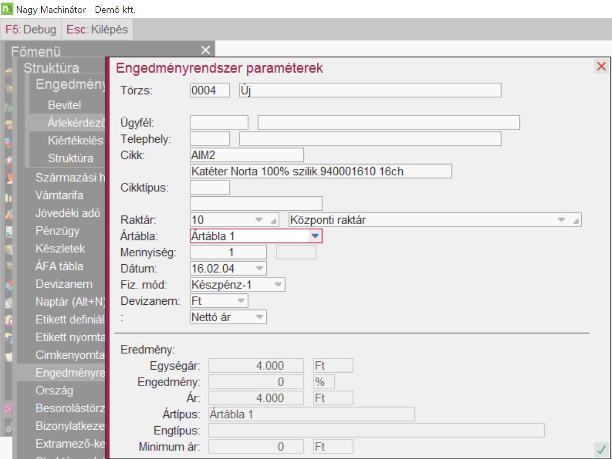Az összeállított engedményrendszert ellenőrizni lehet az Árlekérdezés funkcióval.