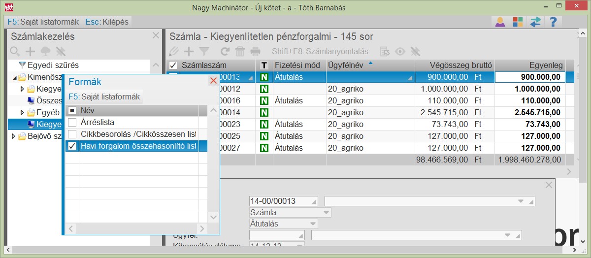 A bizonylatkezelések funkciókban lehetőség van a leszűrt adatok nyomtatására.