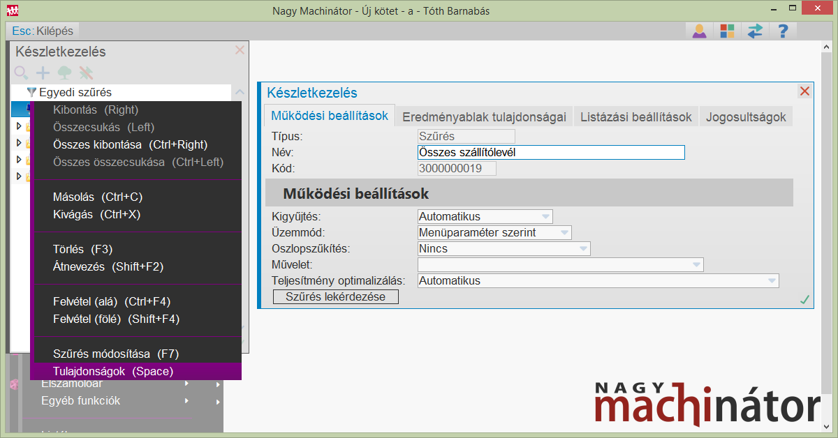 A szűréses tulajdonságaiban lehet beállítani a szűrés működésére vonatkozó adatokat.