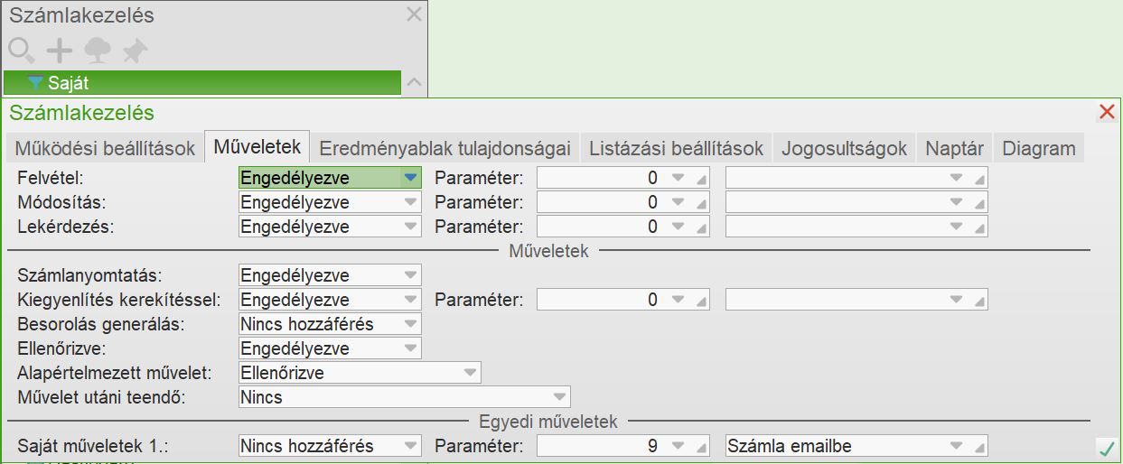 A beviteli ablakban az adott szűrés eredményablakában választható műveletek adhatók meg. Szűrésenként különböző előre létrehozott műveletek vannak, ill. minden szűréshez felvehetők saját műveletek.