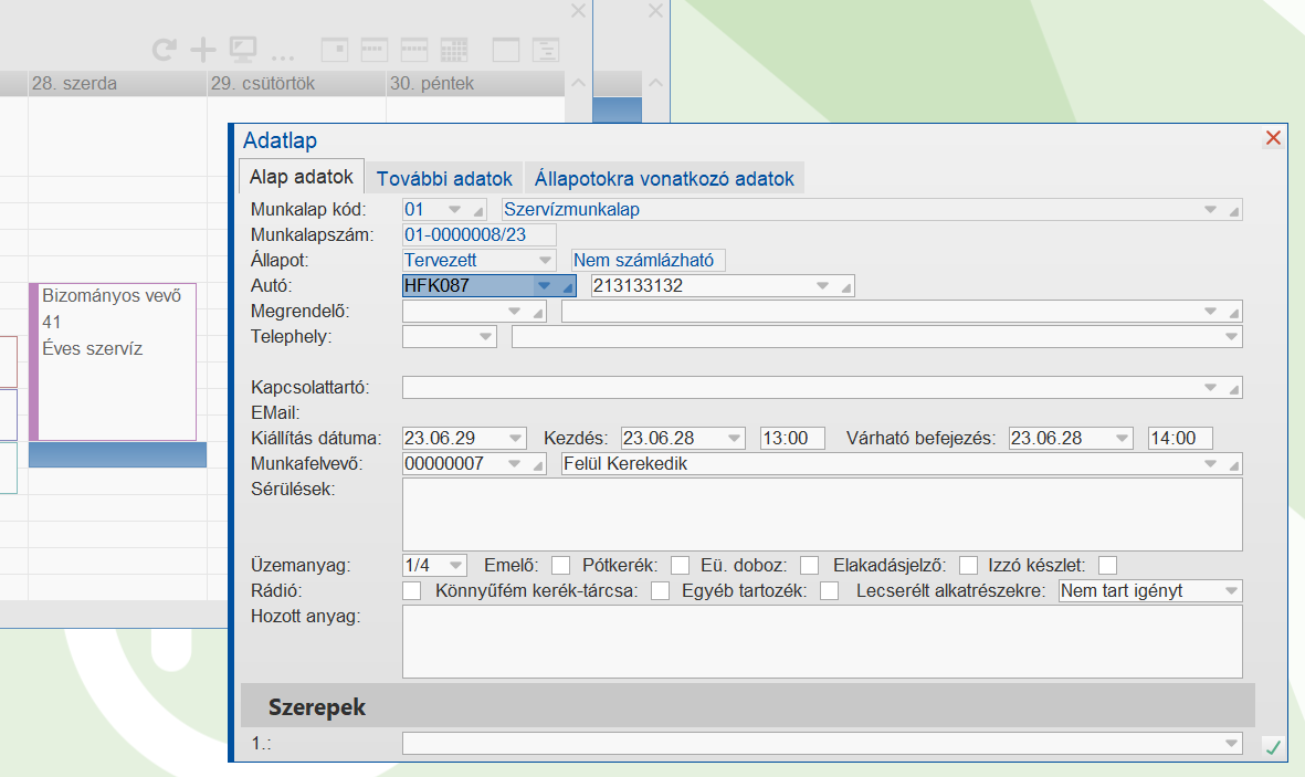 A naptárnézet alkalmazását a Szerviz modulban a következő példában szemléltetjük.