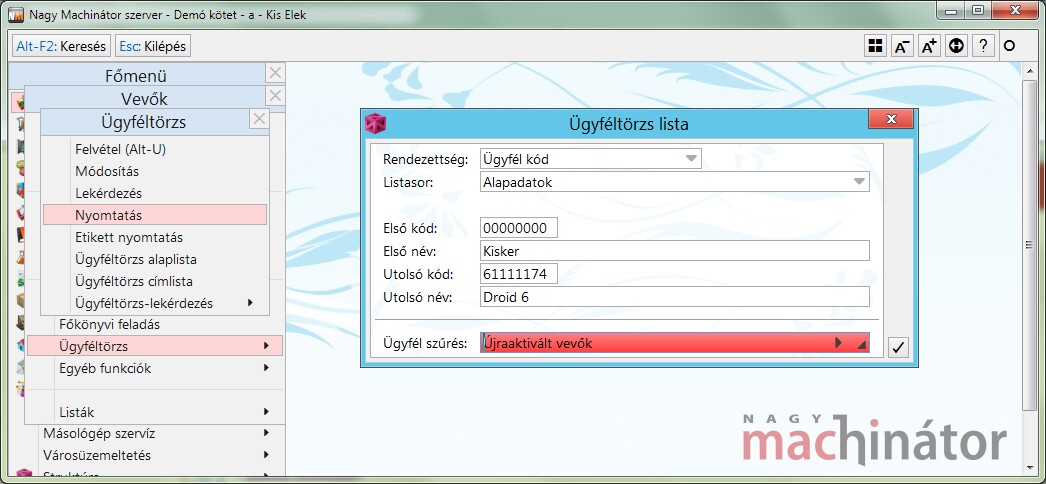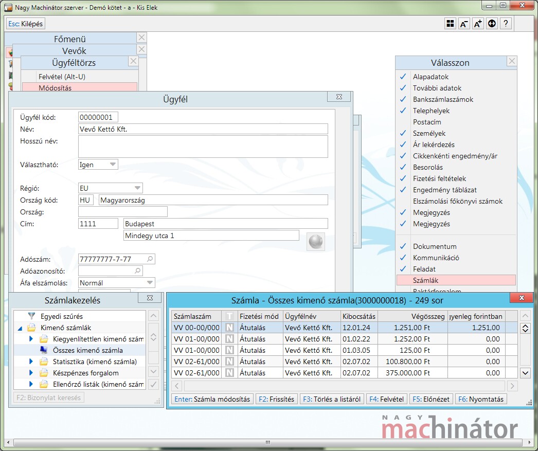 A program lehetőséget biztosít arra, hogy a szűrésfában lévő lekérdezések az egyes struktúra adatokból is elérhetők legyenek. Például a számla szűrés az Ügyféltörzs funkcióba is beépült, Számlák almenüpont név alatt. Ha ezt a menüpontot elindítják, akkor az adott ügyfélre vonatkozó számlákat lehet csak látni.
