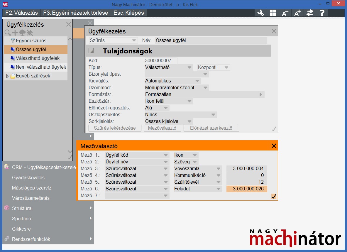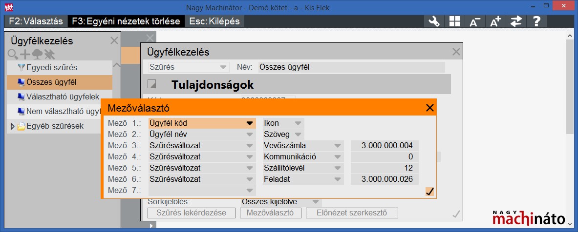 Az egyéni beállítások törlése a Mezőválasztóban az F3: Egyéni nézetek törlése (lásd kép), az Előnézet szerkesztőben a Ctrl F3: Egyéni nézetek törlése funkciógomb megnyomásával történik.