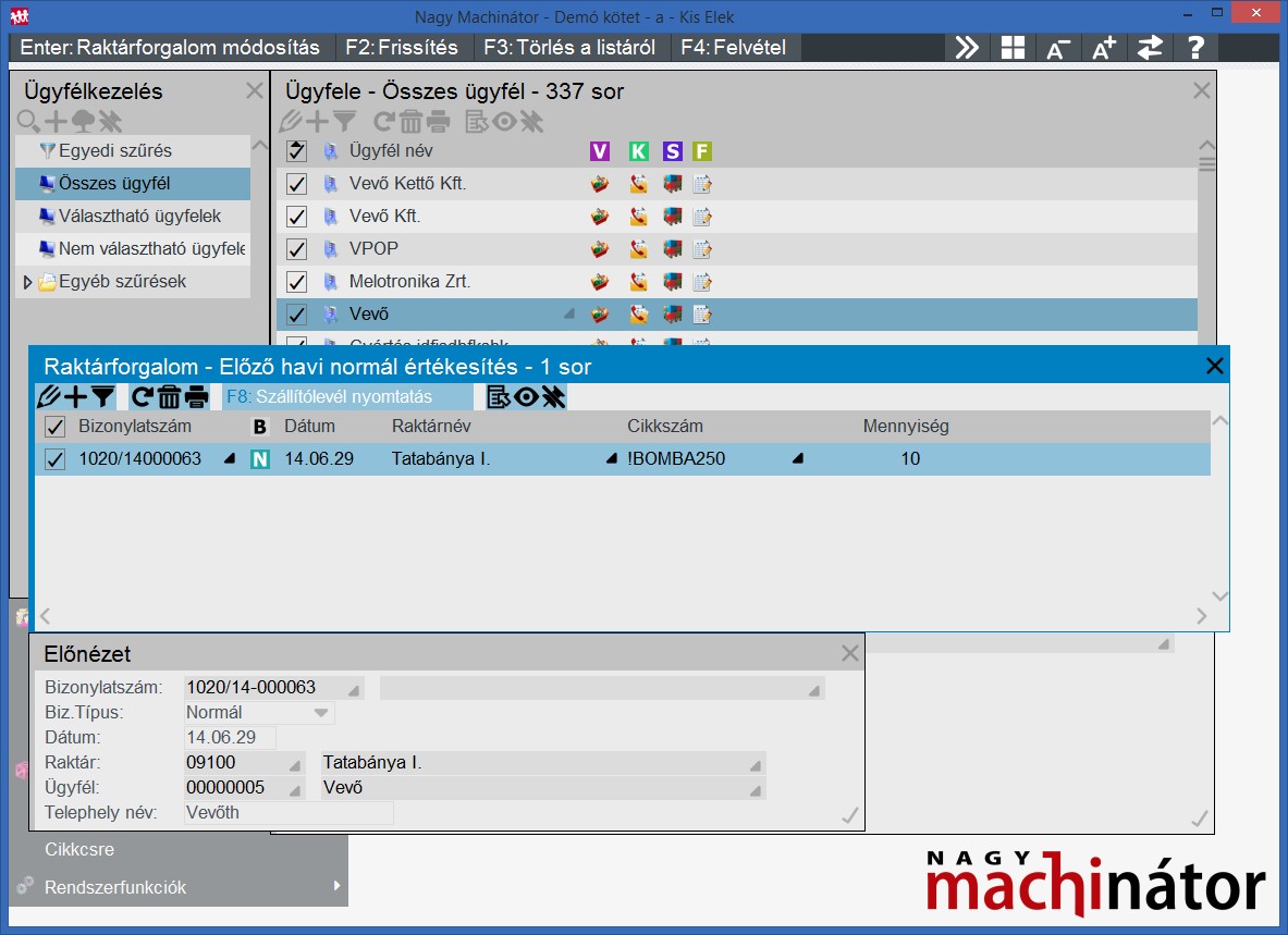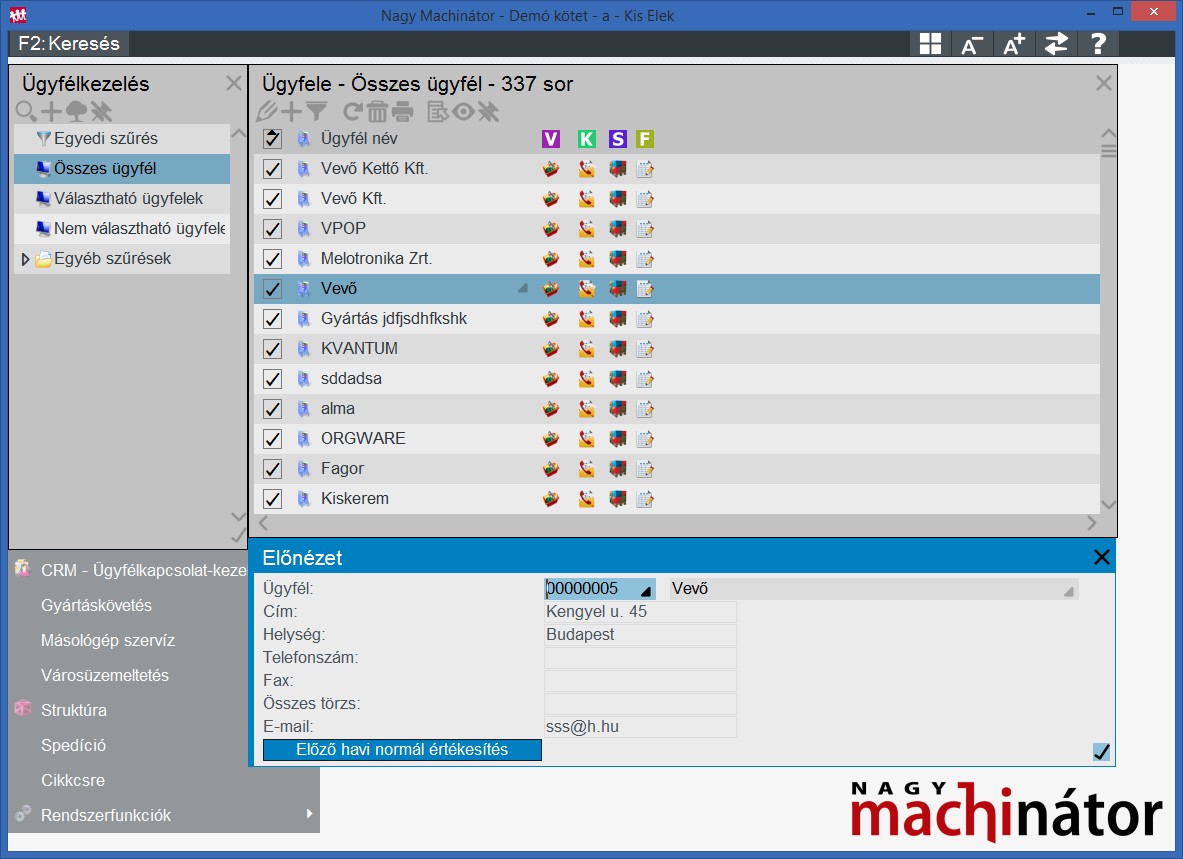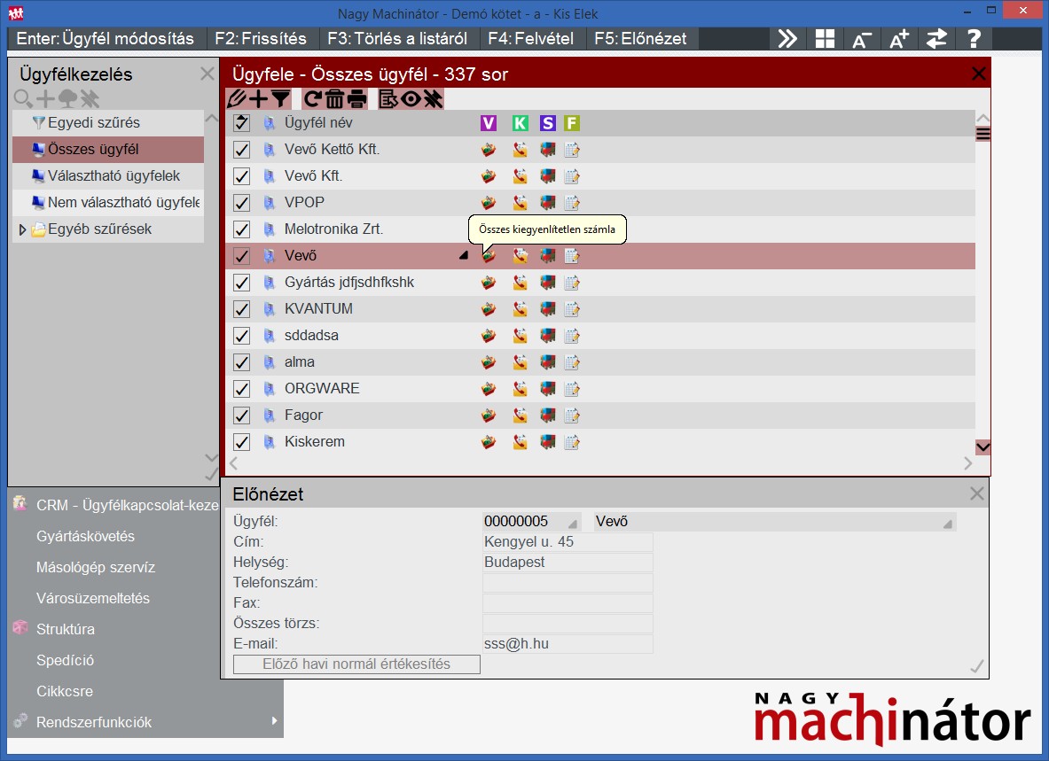 Pl.: Ügyfélszűrésből elindítható egy gombnyomásra az összes kiegyenlítetlen számla lekérdezése, vagy megtekinthetők az ügyféllel folytatott kommunikációk, és az ügyféllel kapcsolatos nyitott feladatok. Ugyanitt megnézhetjük hogy vannak-e nyitott rendelései.