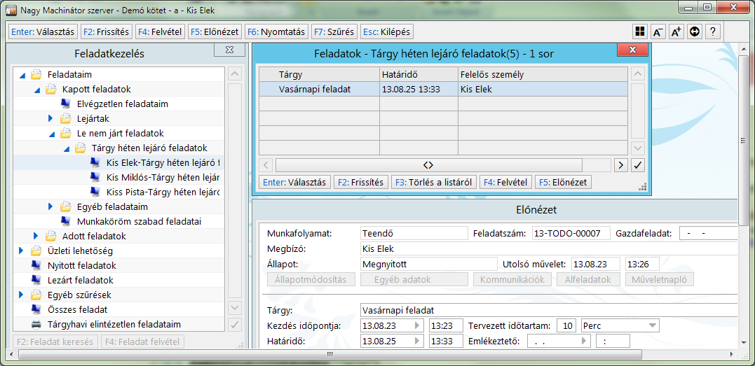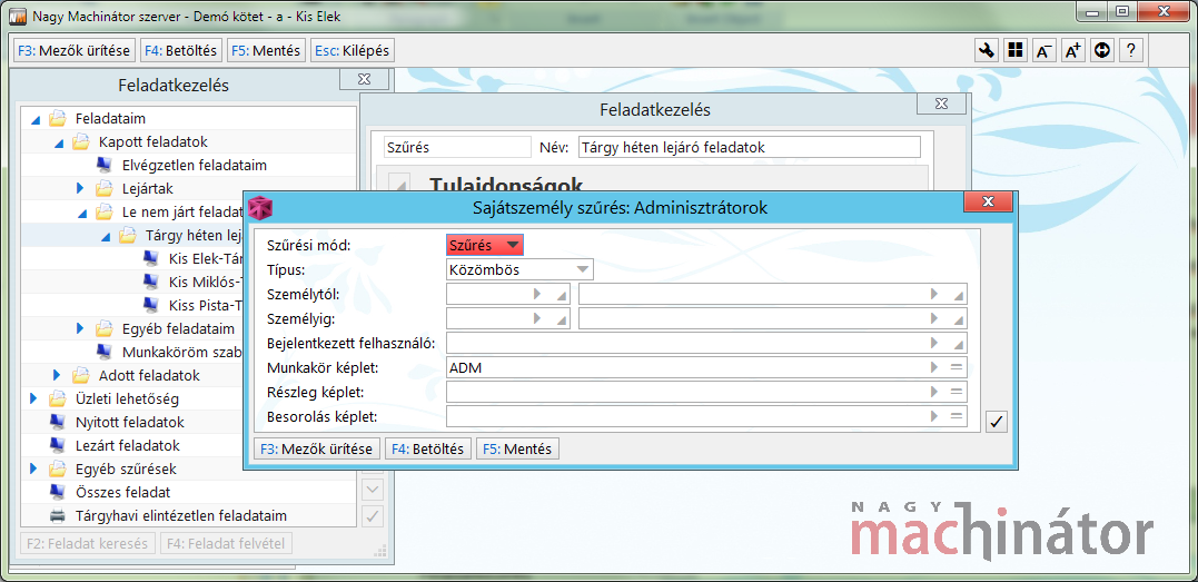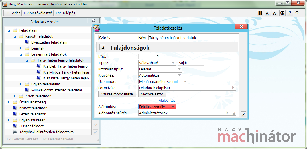 Alkalmazási példa: Feladatkezelés funkcióban a lejárt feladatokat szeretnénk lekérdezni, de mielőtt a fában elindítjuk a lekérdezést ki akarjuk választani, hogy melyik személyre vonatkozzon a lekérdezés. Ráadásul az is feladat részét képezi, hogy csak adminisztrátor munkakört betöltött személyek közül lehessen választani.