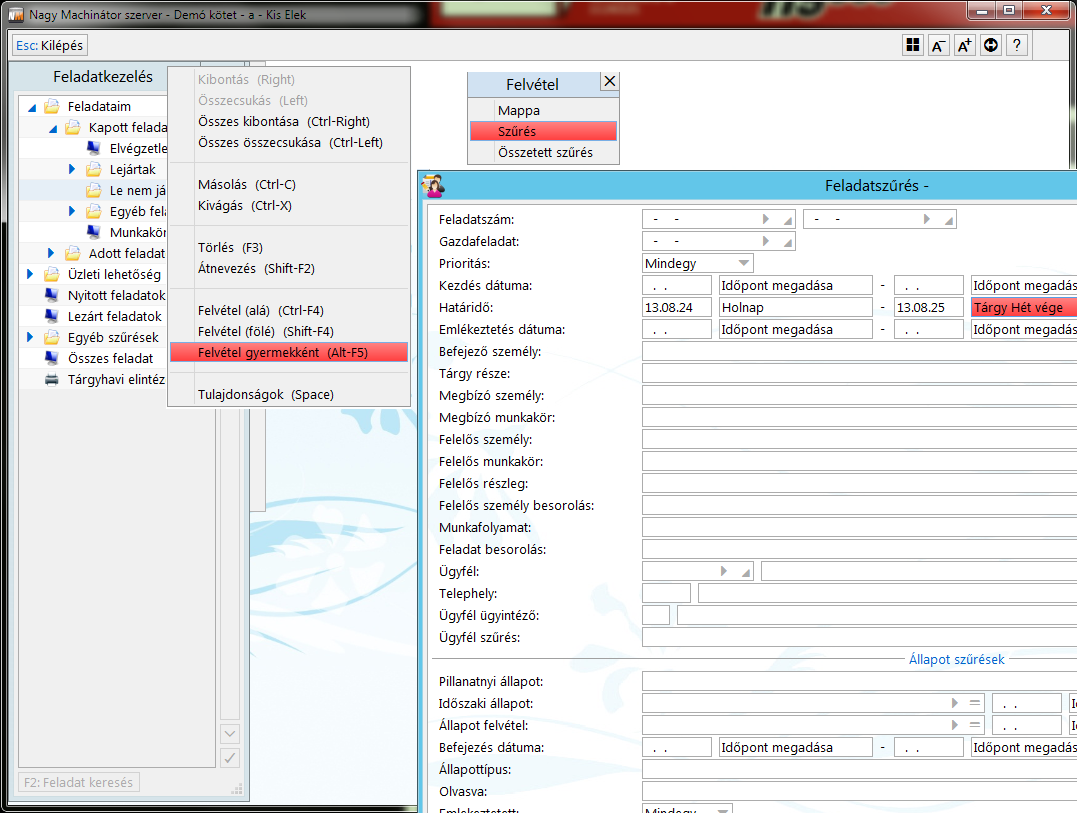 Új szűrés létrehozása esetén először ki kell tölteni a szűrésablakot. Pl.: a képen azt láthatjuk, hogy a Le nem járt feladatok mappába egy olyan szűrést fogunk felvenni, amelynek a tárgy héten lejáró feladatok elnevezést lehet adni, hiszen a Határidő mezőibe relatív dátum megadás történik. (Azért fog belekerülni a mappába, mert gyermekként lett kiválasztva a felvétel, lásd kép.)