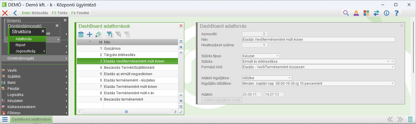 Meg lehet határozni, hogy az Adatforrás milyen időközönként legyen kigyűjtve, frissítve. Csak frissítés gombra Az adaforrás akkor fog frissülni, amikor a felhasználó a Döntéstámogató panelene kéri az adatok frissítését. Ha az érvényességük lejárt Meg lehet határozni, hogy milyen időközönként járjon le az adatok érvényessége (Pl.: 1 nap, két perc stb.), és az érvényesség lejárta esetén automatikusan frissíti az adatokat. Időzítve Meg lehet adni, hogy milyen intervallumban milyen időközönként történjék meg a frissítés. Pl.: Minden naptári nap 08:00-16:30-ig 10 percenként |