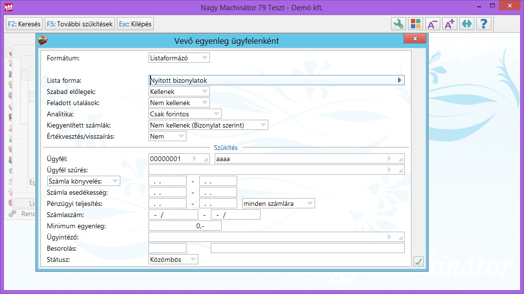 Vevő egyenleg lista lekérése, az elkészített formával.