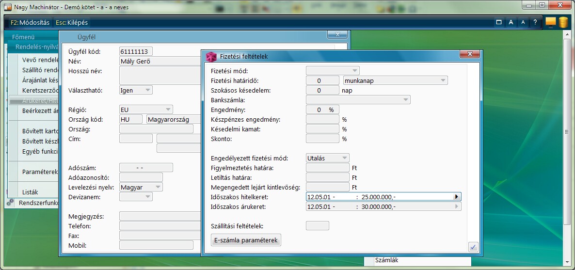 Az Árukeret/Hitelkeret összegét meg lehet adni az Ügyféltörzs/Fizetési feltételekben is, ha be van állítva a KeretEll paraméter.