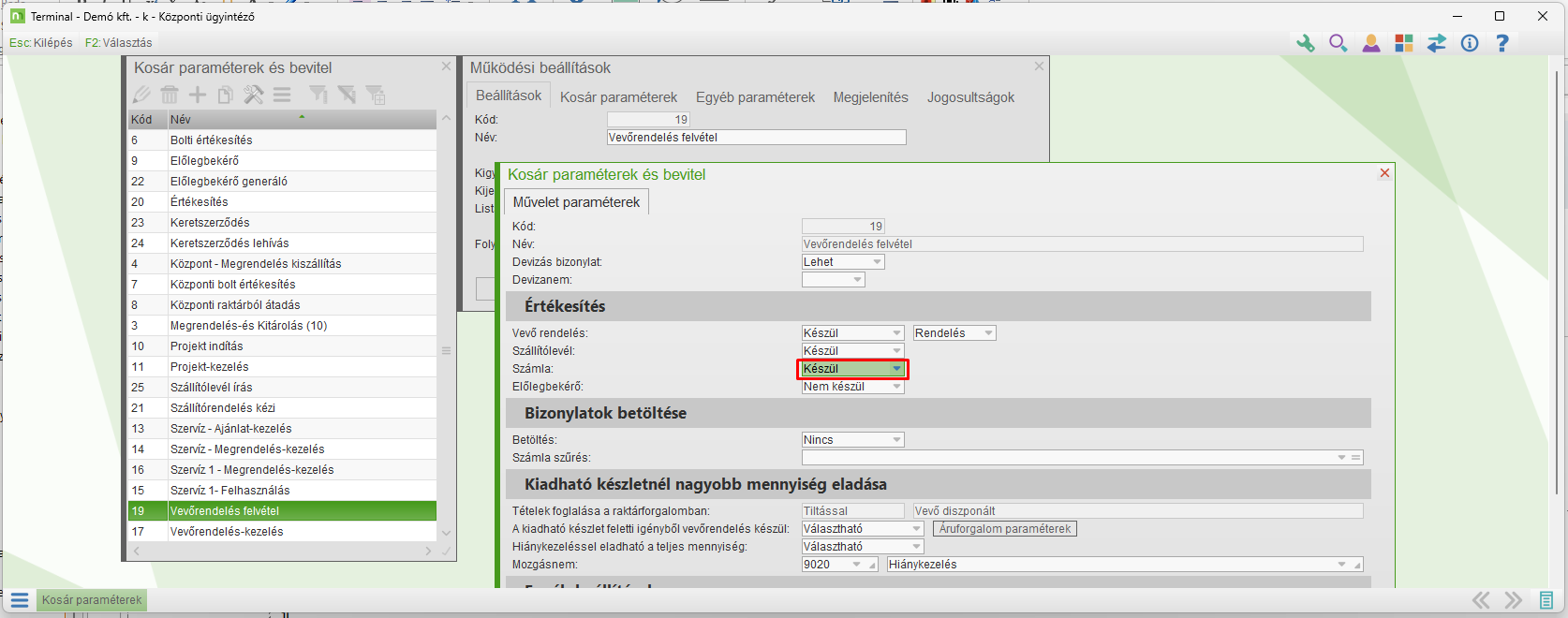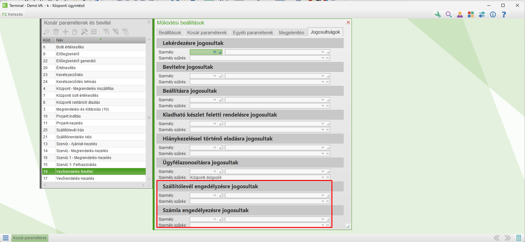 Vásárlóazonosítás eljárás esetén meg lehet változtatni az ajánlott értéket. Az itt megadott bizonylattípust fogja megengedni a program. Ha üres az érték, akkor minden engedélyezett. Ha egy érték nem engedélyezett, a Kosár paraméterekben egy felhasználó csoportnak még lehet jogot adni a bizonylatra. |
