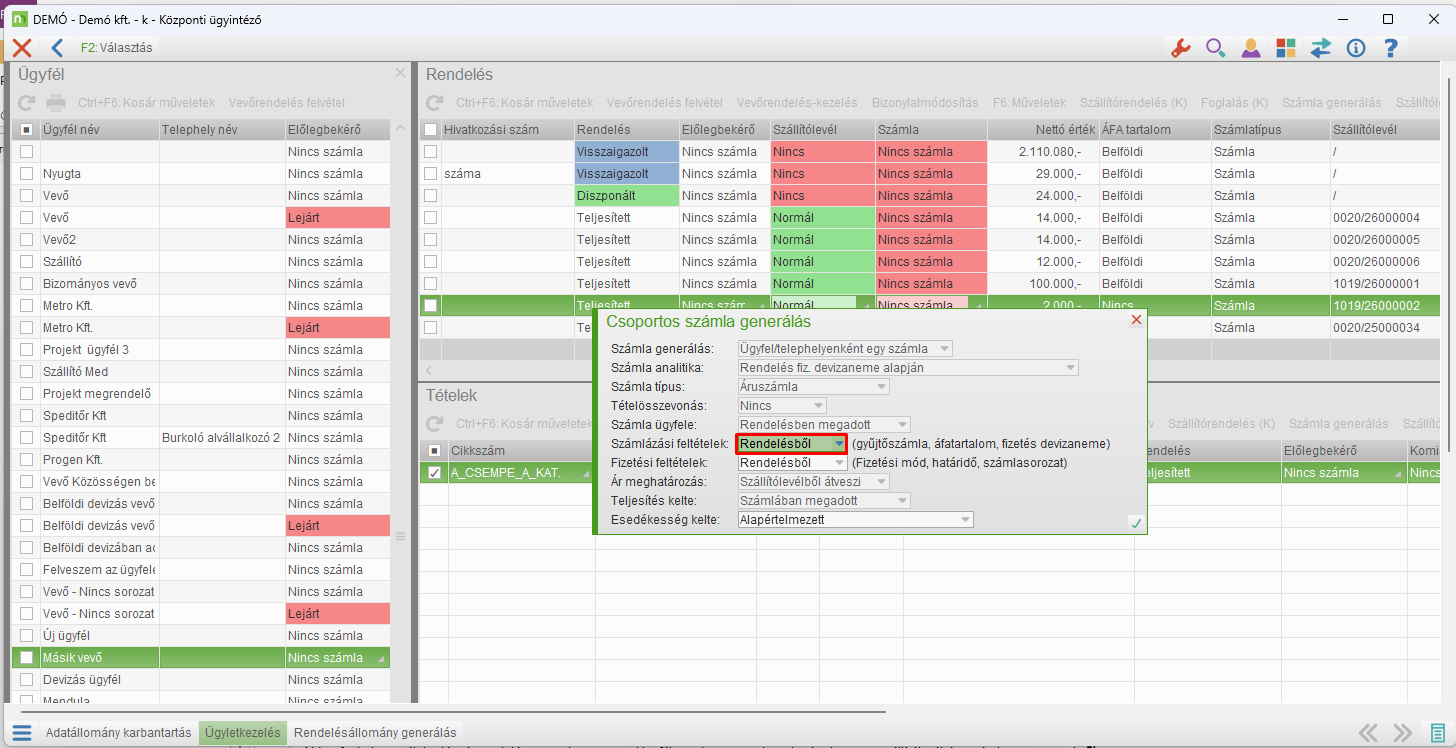 - Csoportos / Tételes számla generálás