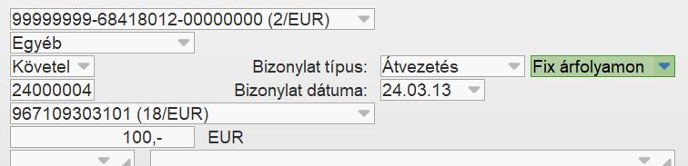 Egyéb jellegnél ha Átvezetés típust választunk, kérhető a Fix árfolyam. Amennyiben mind a Követel, mind a Tartozik irányú átvezetésnél ezt használjuk, a program a bankok között fixen a kiadó bank átlagárfolyamát ajánlja fel (de átírható marad), így elkerülhető az árfolyam különbözet (korábban a kapcsoló nélkül a Tartozik irányú tételnél a napi árfolyamon történt a bevételezés). A beállítás mezőparaméterezéssel ajánltatható is.