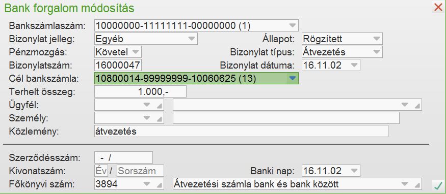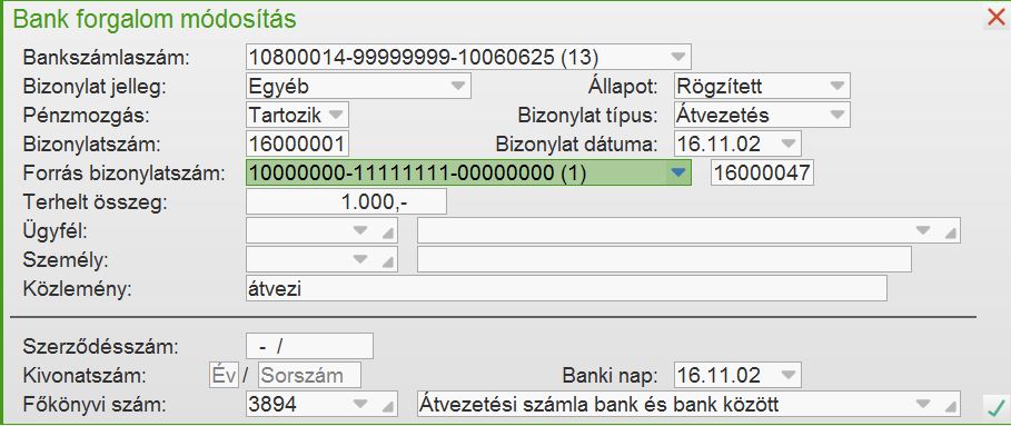 Az Átvezetés bizonylat típussal egyszerűen megoldható két bank közötti pénzmozgás rögzítése és könyvelése.