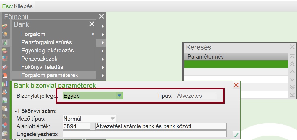 3. A főkönyvbe a Bank bizonylat paraméterek alapján (melyben az Egyéb jellegű, Átvezetés típusú sort kell kikontírozni) ajánlott átvezetési számra fog felkerülni az érték mind a Követel, mind a Tartozik irányú bizonylatból. A paraméter ajánlás a bizonylat rögzítésekor automatikus, azaz nem kell hozzá F6-ot nyomni.