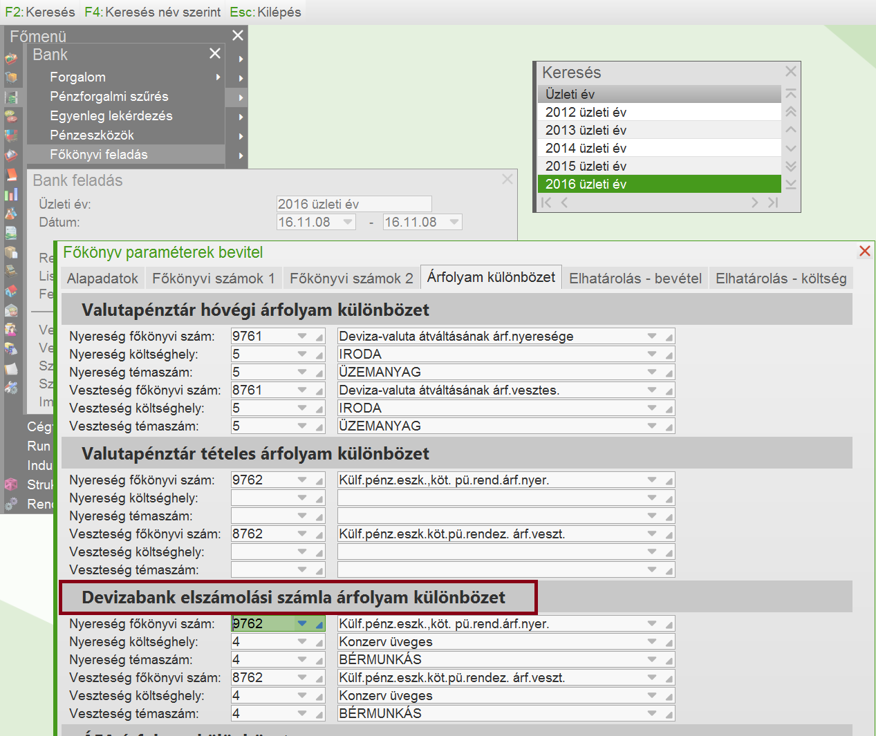 4. Amennyiben a forrás és/vagy a cél bankszámla devizás, felléphet árfolyam különbözet. Ezt a Főkönyv paraméterek Árfolyam különbözet fülén található főkönyvi számokra fogja feladni a program a Tartozik irányú tétel bizonylatszámával.
