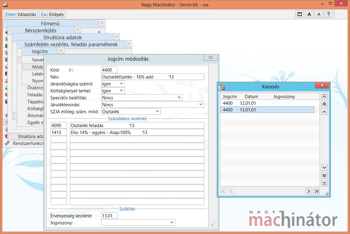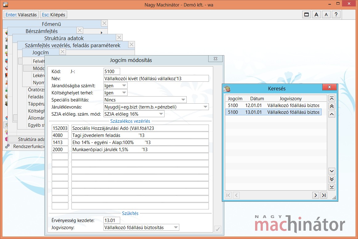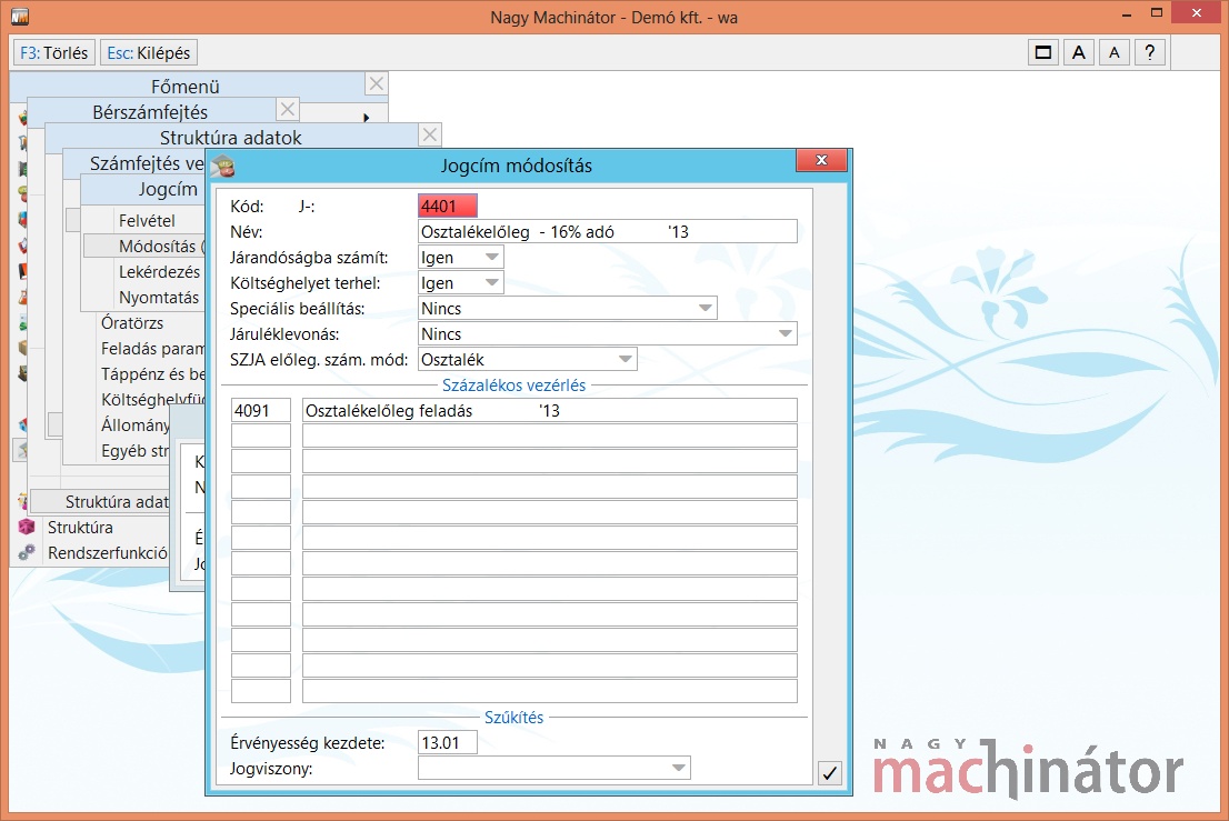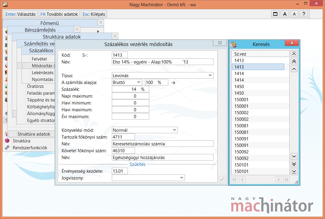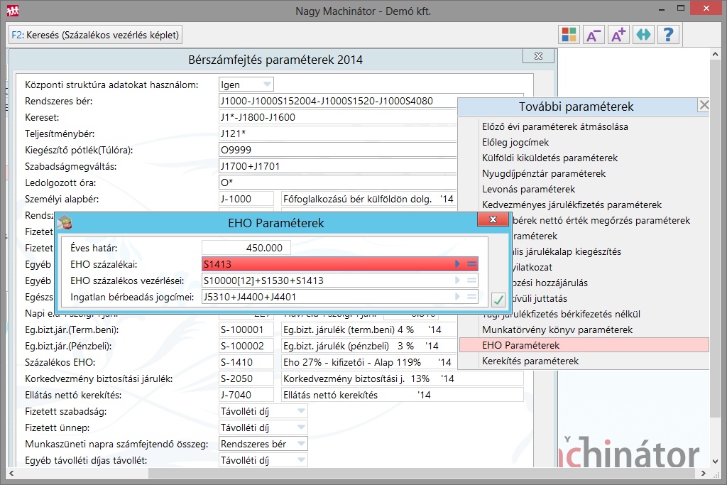 EHO százalékos vezérlései: Azok a százalékos vezérlések, amelyeket figyelembe kell venni a felső határ figyelésénél. A mezőkben képletként több százalékos vezérlést illetve jogcímet is meg lehet adni.