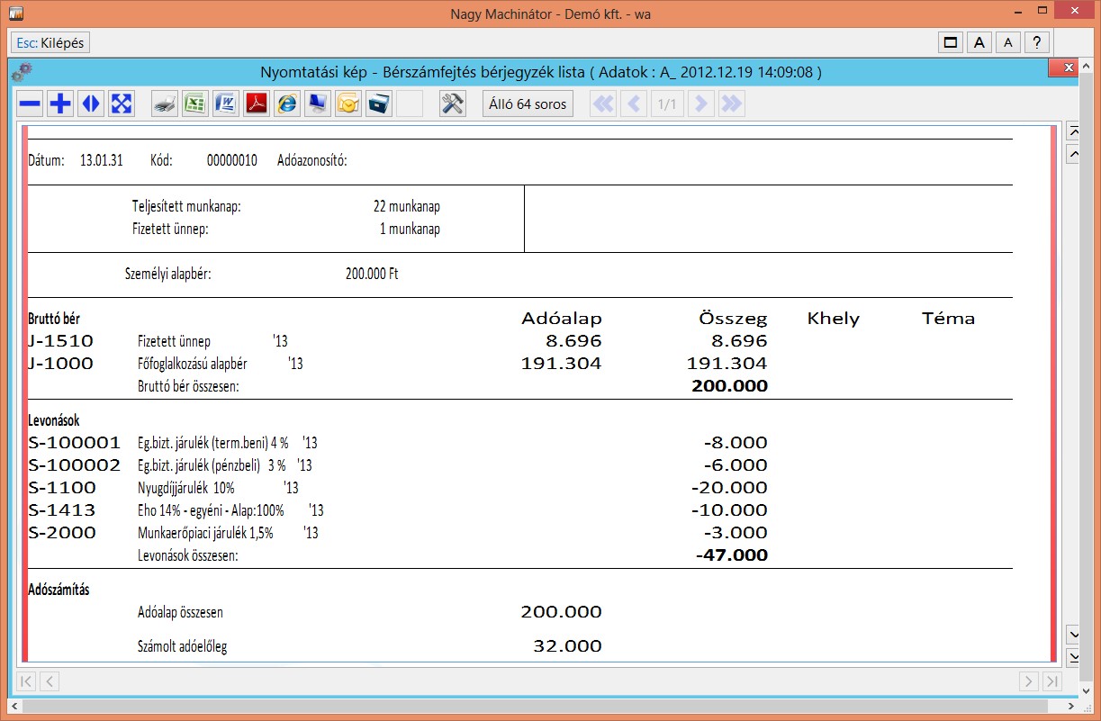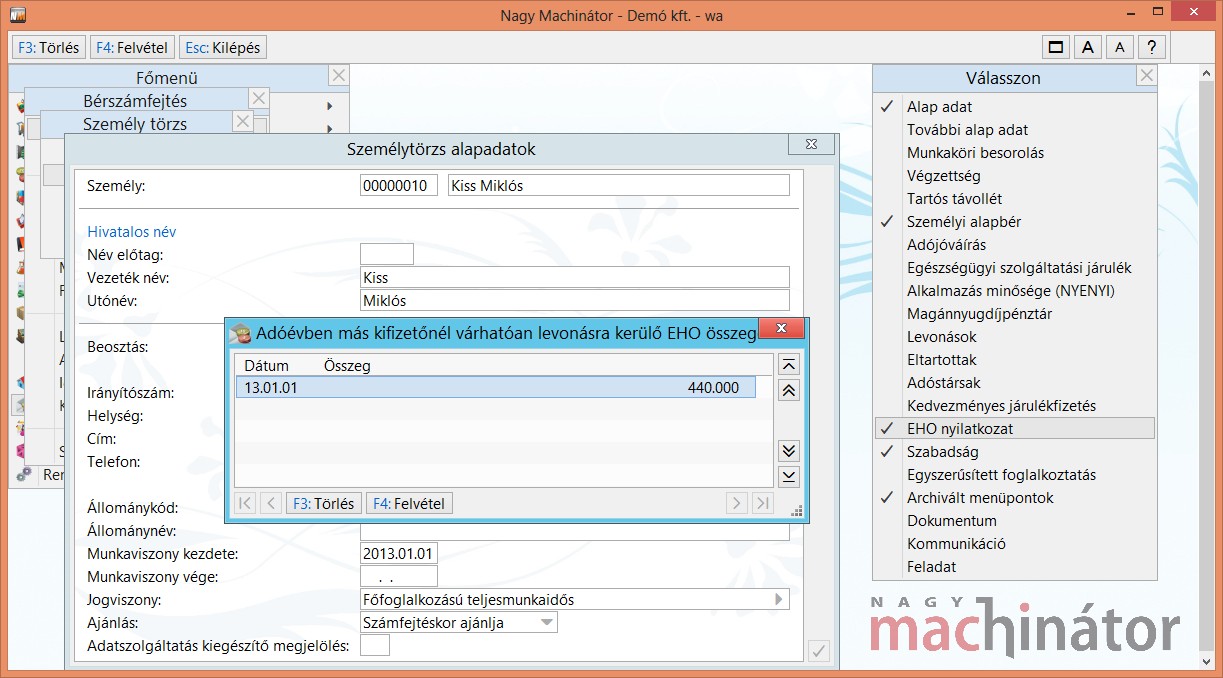 Az itt megadott összeggel csökken a 450.000 Ft-os keret, így ehhez igazítva fogja a program a bérszámfejtésnél az EHO-t számolni.