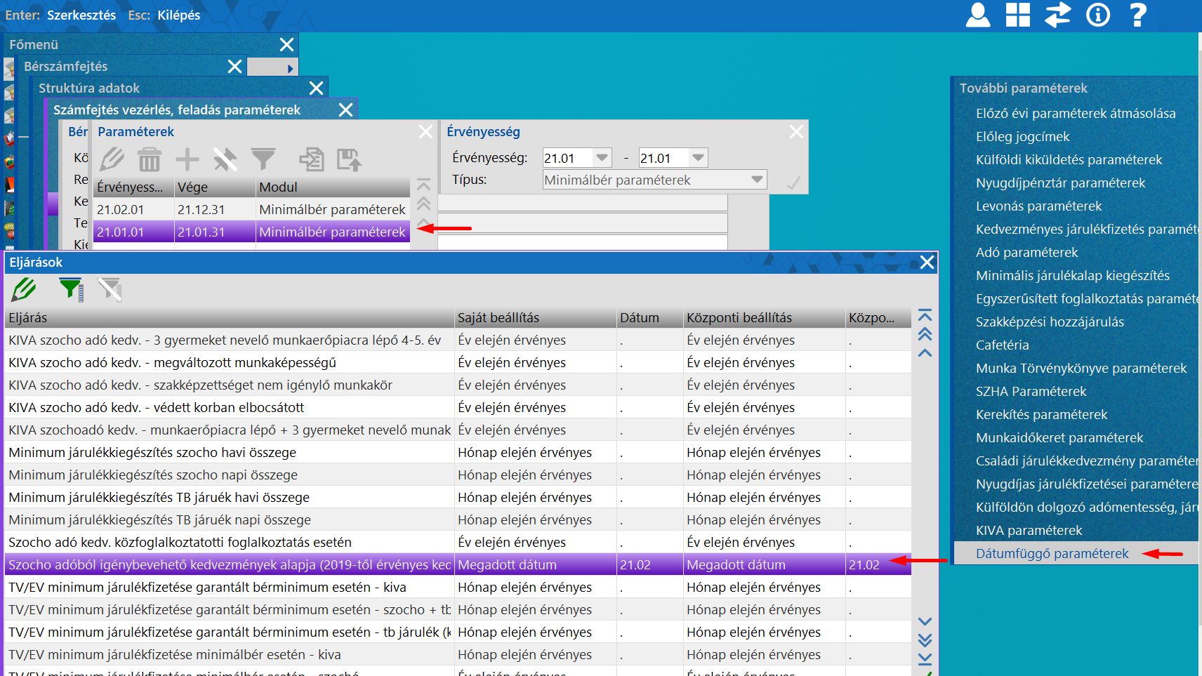 A minimálbér összegét különböző eljárások esetén használja a program, és az egyes eljárásokhoz tartozó jogi háttér különböző módon hivatkozik a minimálbérre.