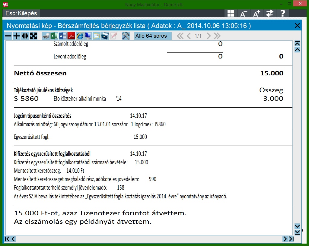 Amennyiben a mező értékét Igen-re állítjuk, abban az esetben a bérjegyzékre nyomtatásra kelül az adott kifizetésre vonatkozó elszámolás. Feltüntetésre kerül az adóköteles jövedelem összege, valamint a mentesített keretösszeg (a számfejtés során beállított minimálbér vagy garantált bérminimum figyelembevételével). Az alábbi példában 3 nap egyszerűsített foglalkoztatás utáni számfejtés látható. |