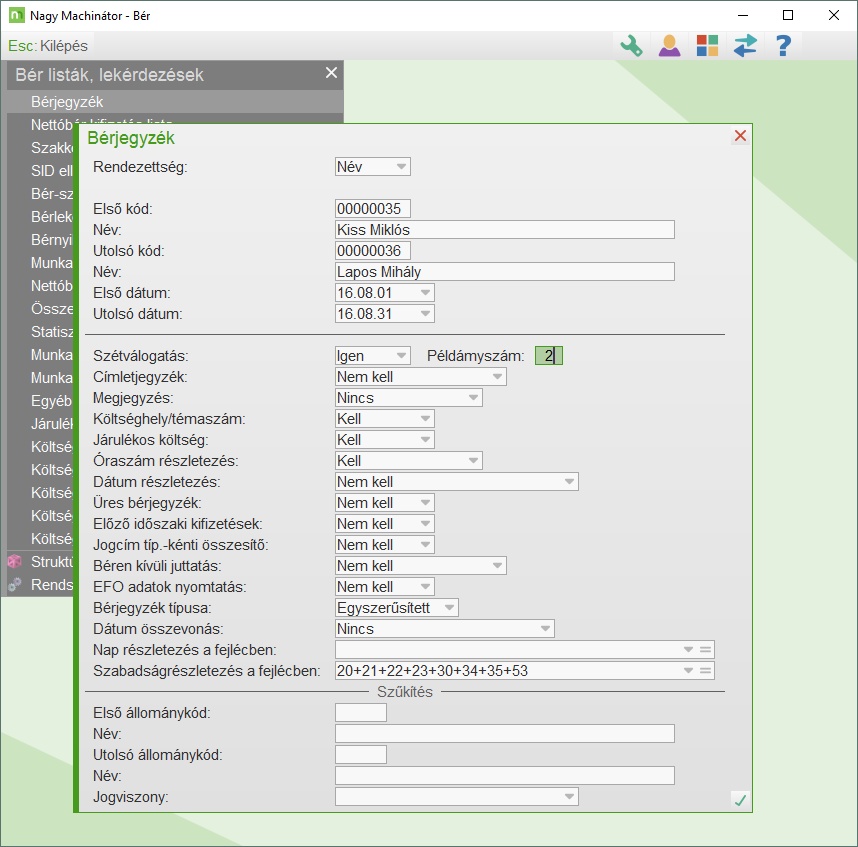 A bérjegyzék nyomtatási időszakát adhatjuk meg. |