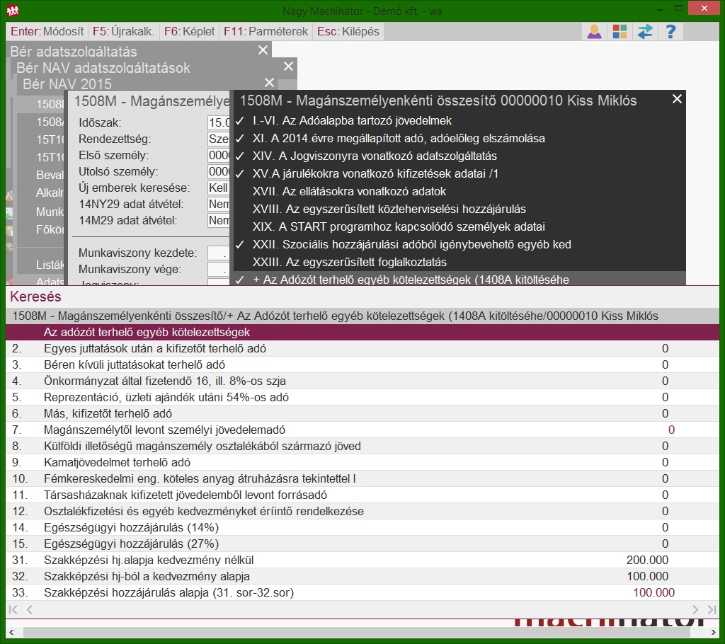 A 1608M menüpont elindítása után először az időszakot kell megadni. Az időszak megadása után, a beállított személyszűkítést figyelembe véve a program legenerálja az adatokat. A generálás végén megjelenő ablakban azok szerepelnek, akikre a tárgy időszakban a fentieknek megfelelő adatot talált a program. Még ebben az ablakban lehetőséget biztosít a program egyes emberek törlésére, vagy új emberek hozzáadására is. Az emberek adatait meg lehet tekinteni, ill. igény esetén módosítani is lehet azokat.