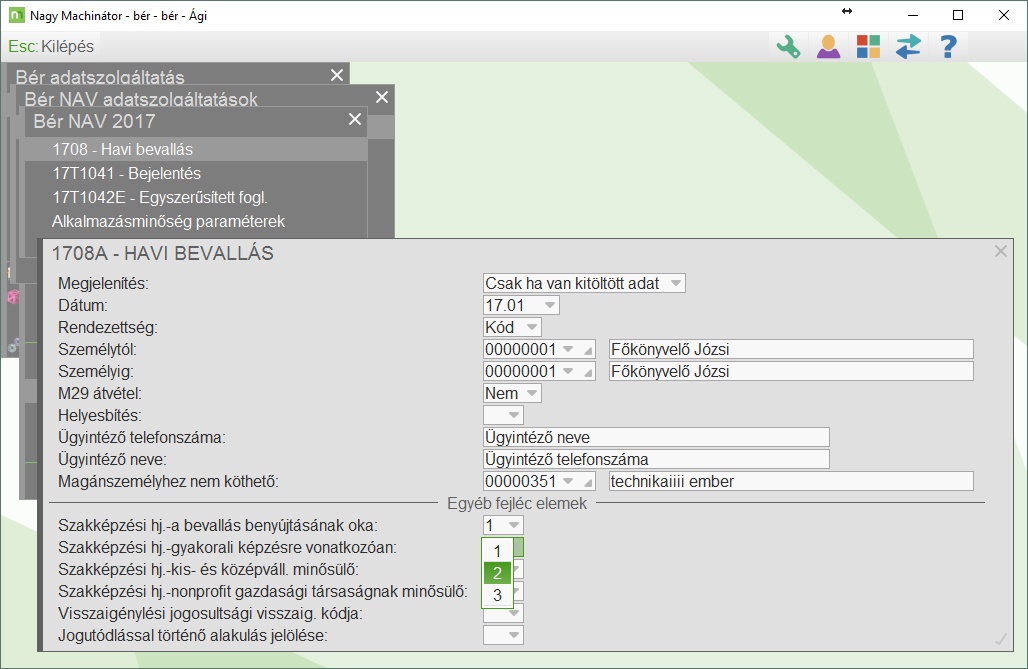A 1708M menüpont elindítása után először az időszakot kell megadni. Az időszak megadása után, a beállított személyszűkítést figyelembe véve a program legenerálja az adatokat. A generálás végén megjelenő ablakban azok szerepelnek, akikre a tárgy időszakban a fentieknek megfelelő adatot talált a program. Még ebben az ablakban lehetőséget biztosít a program egyes emberek törlésére, vagy új emberek hozzáadására is. Az emberek adatait meg lehet tekinteni, ill. igény esetén módosítani is lehet azokat.