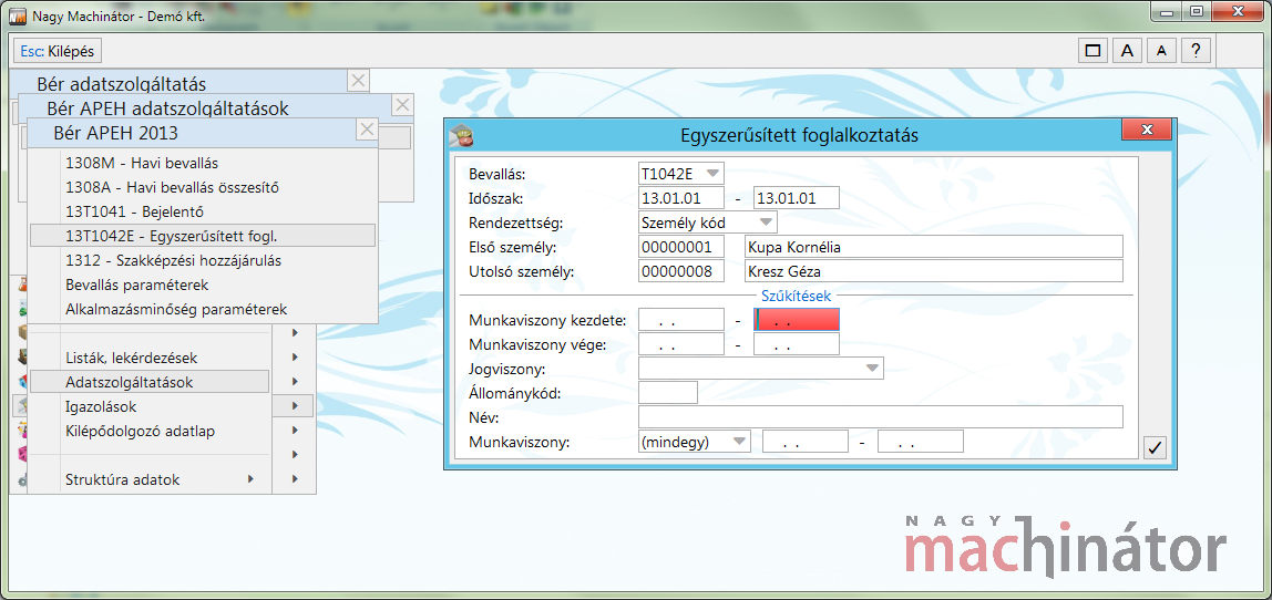 A személytörzsben, a Egyszerűsített foglalkoztatás menüpontban megadható adatok alapján készül el a bejelentés.
