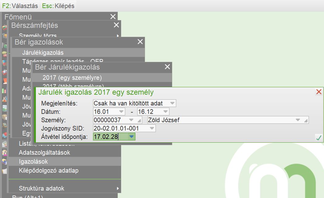 Mivel egy személynek több (az adott időszakban élő) alkalmazásminősége is lehet, lehetőség van arra, hogy személyenként vagy csoportosan megválasszuk, melyik alapján kívánunk igazolást készíteni. Külön menüpontban kezelhetjük az egy személyre kért igazolást és egy másikban a csoportosat, ezért egy személy esetén jogviszony SID-et, míg több személy esetén alkalmazás minőség képletet adhatunk meg. Így szükség esetén ki lehet zárni azokat az alkalmazás minőségeket (pl. 60), amelyekről nem kell igazolást készíteni.