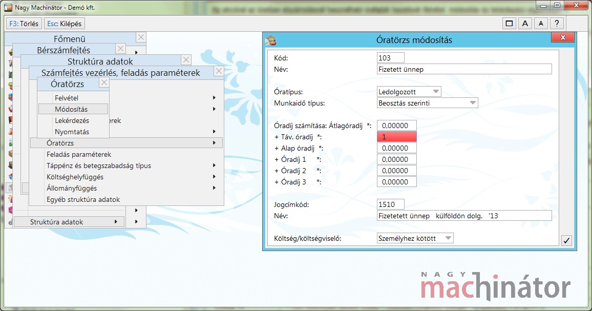 Az óradíj számítása részben lehet meghatározni, hogy az adott órakódra milyen óradíjat számfejtsen a program. Ha valamelyik komponensre nincs szükségünk, ott a szorzót hagyjuk nullán.