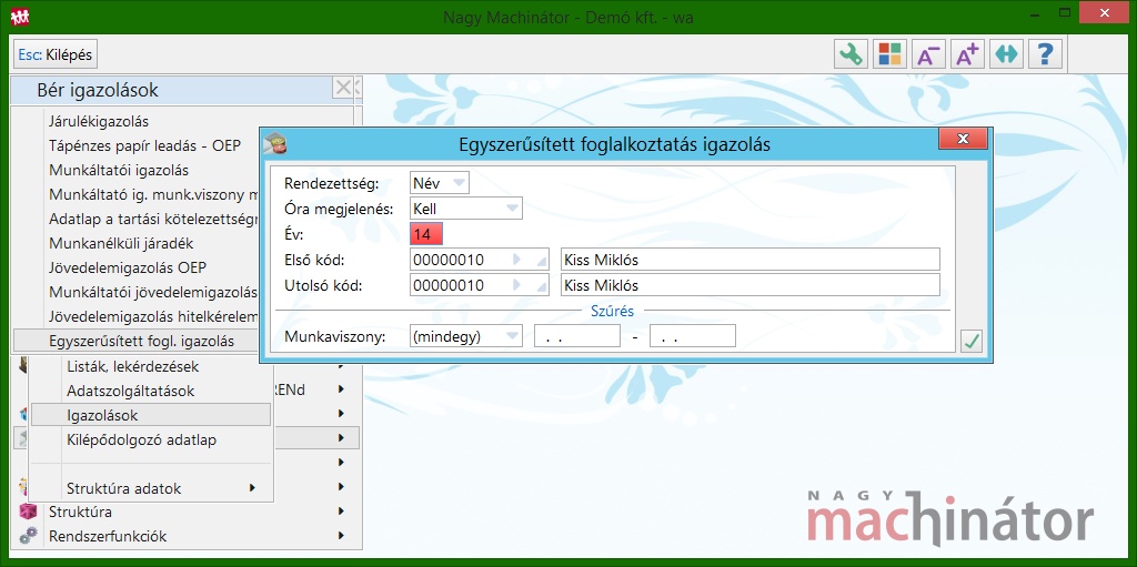 Az igazolás az Egyszerűsített foglalkoztatás keretein belül dolgozó munkavállalók évi teljesítését tartalmazza.