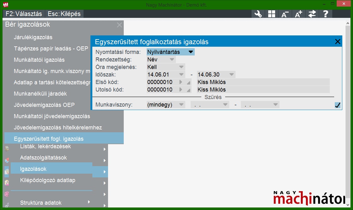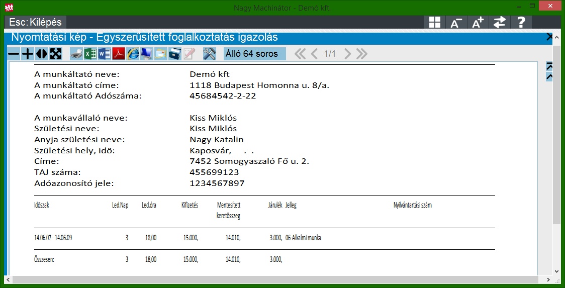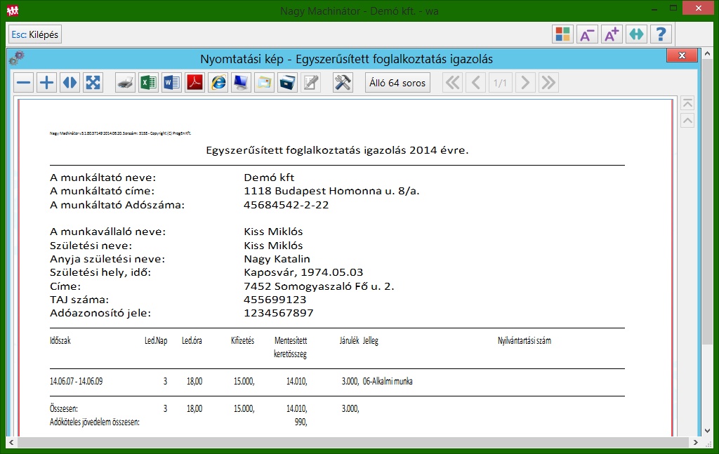 Az igazoláson feltűntetésre kerül az egy időszakra jutó mentesített keretösszeg (a számfejtés során beállított minimálbér vagy garantált bérminimum figyelembevételével), valamint az aktuális évre eső adóköteles jövedelem. Vagyis a listán az egyszerűsített foglalkoztatás keretében foglalkoztatottnak az aktuális évi összes teljesítése feltűntetére kerül, attól függetlenül, hogy korábban adtunk-e már ki neki ilyen igazolást.